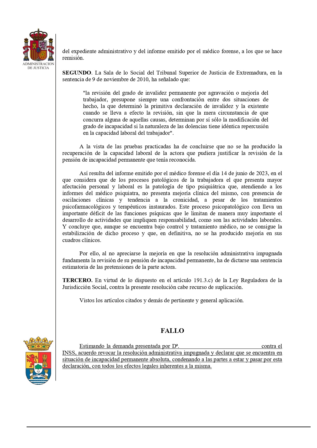 Caso de Éxito: el Juzgado de lo Social de Badajoz devuelve al trabajador su pensión de incapacidad absoluta que el INSS le había rebajado a total por mejoría. INSS Seguridad Social Badajoz, Cáceres, Mérida, Don Benito, Villanueva de la Serena.