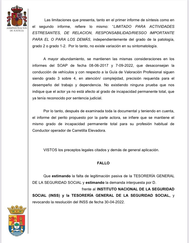 Presentamos la demanda de Incapacidad Permanente. Tras unos meses se admitió a trámite la demanda y nos notificaron la fecha del juicio en el Juzgado de lo Social de Badajoz. Tras la realización del juicio, llegó la sentencia donde el Magistrado entendía que la limitación que presentaba nuestro cliente le continuaba limitando para ejercer su profesión habitual de conductor de carretilla elevadora.