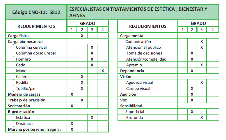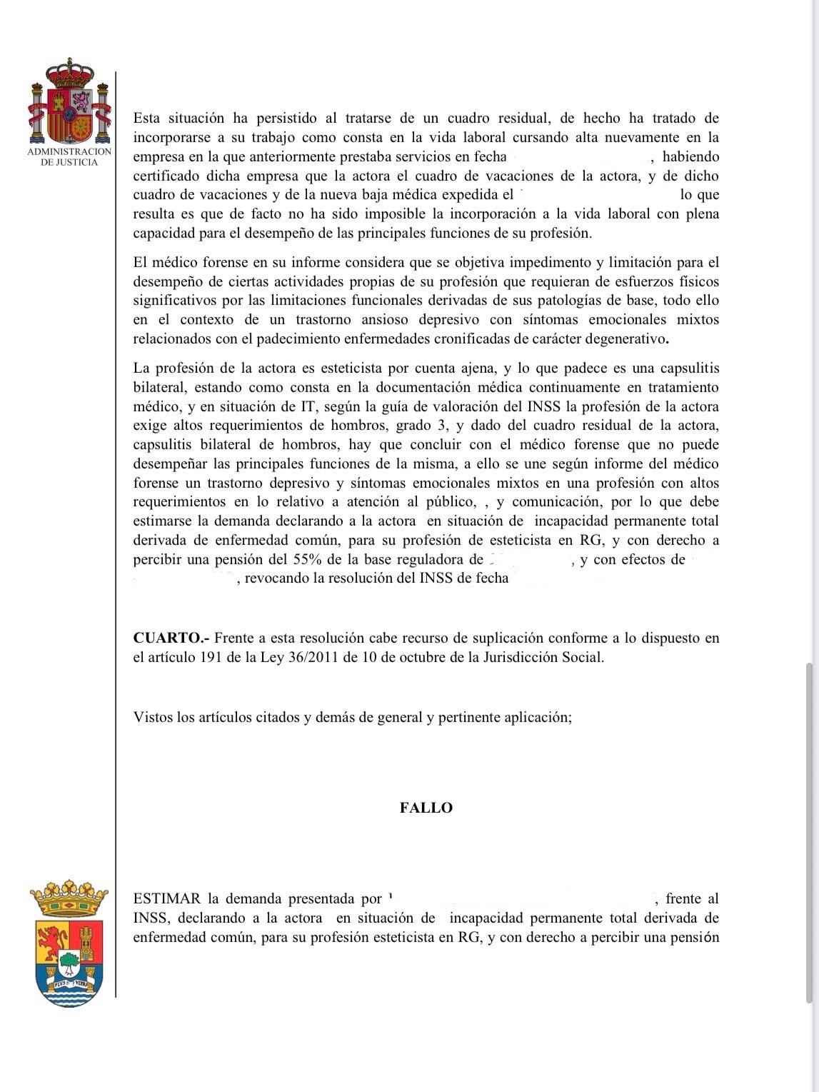 «La profesión de la actora es esteticista por cuenta ajena, y lo que padece es una capsulitis, estando como consta en la documentación médica continuamente en tratamiento médico, y en situación de IT, según la guía de valoración del INSS la profesión de la actora exige altos requerimientos de hombros, grado 3, y dado del cuadro residual de la actora, hay que concluir que no puede desempeñar las principales funciones de la misma, a ello se une un trastorno depresivo y síntomas emocionales mixtos en una profesión con altos requerimientos en lo relativo a atención al público y comunicación, por lo que debe estimarse la demanda declarando a la actora en situación de incapacidad permanente total derivada de enfermedad común, para su profesión de esteticista, y con derecho a percibir una pensión del 55% de la base reguladora, revocando la resolución del INSS».