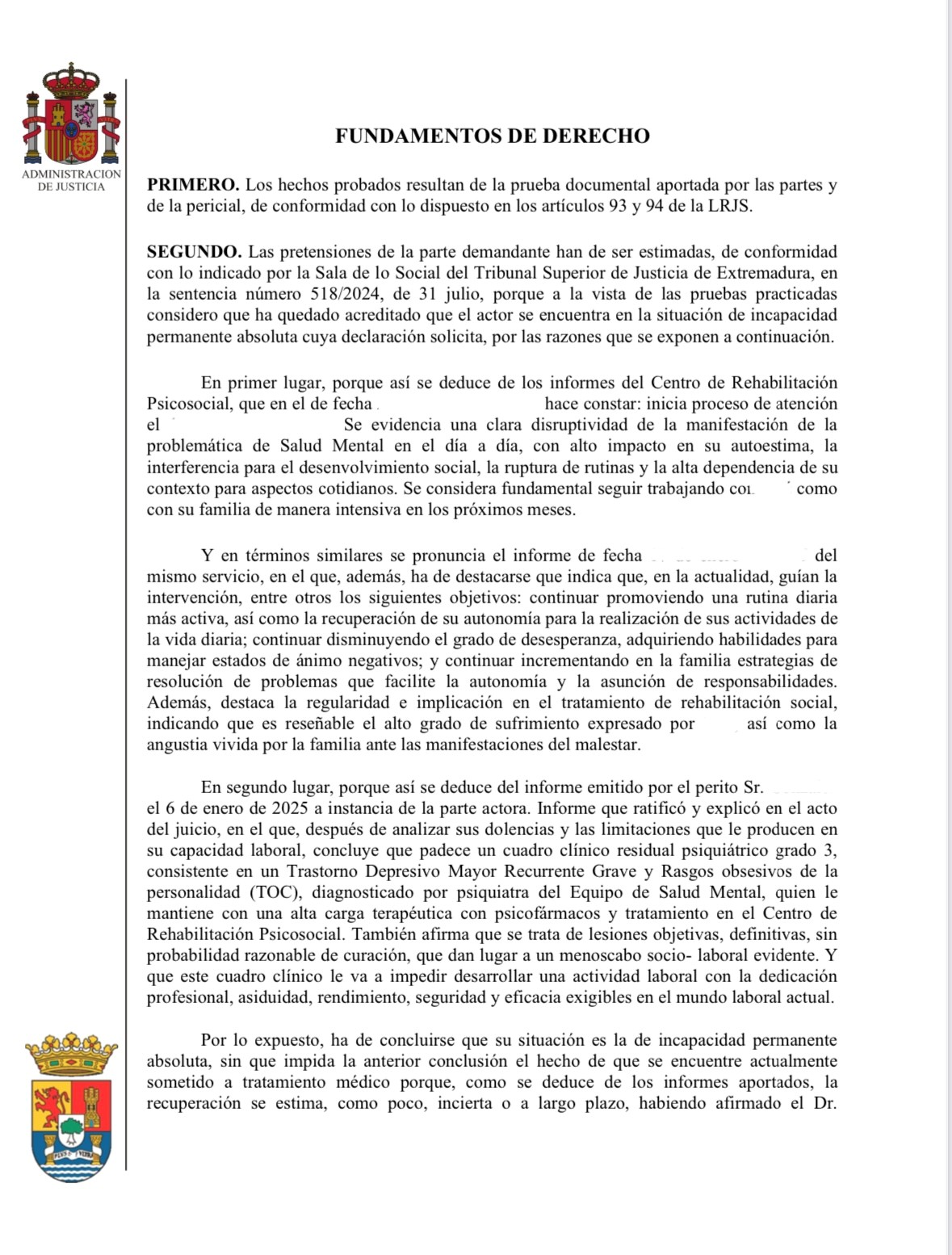«Las pretensiones de la parte demandante han de ser estimadas, de conformidad con lo indicado por la Sala de lo Social del Tribunal Superior de Justicia de Extremadura, en la sentencia número 518/2024, de 31 julio, porque a la vista de las pruebas practicadas considero que ha quedado acreditado que el actor se encuentra en la situación de incapacidad permanente absoluta cuya declaración solicita, por las razones que se exponen a continuación.