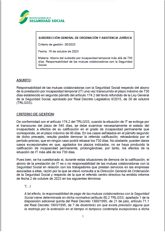 Desarrollo: el 16 de ocubre de 2023, el INSS publicó su criterio de gestión nº 26/2023, que establece que si la Incapacidad Temporal dura más allá de los 730 días, corresponde a las mutuas colaboradoras de la Seguridad Social el abono de dicha prestación de Incapacidad Temporal. Por tanto el beneficiario tiene derecho a seguir percibiendo el subsidio en los supuestos excepcionales en los que la calificación de la incapacidad permanente se demora más allá del plazo máximo de 730 días.